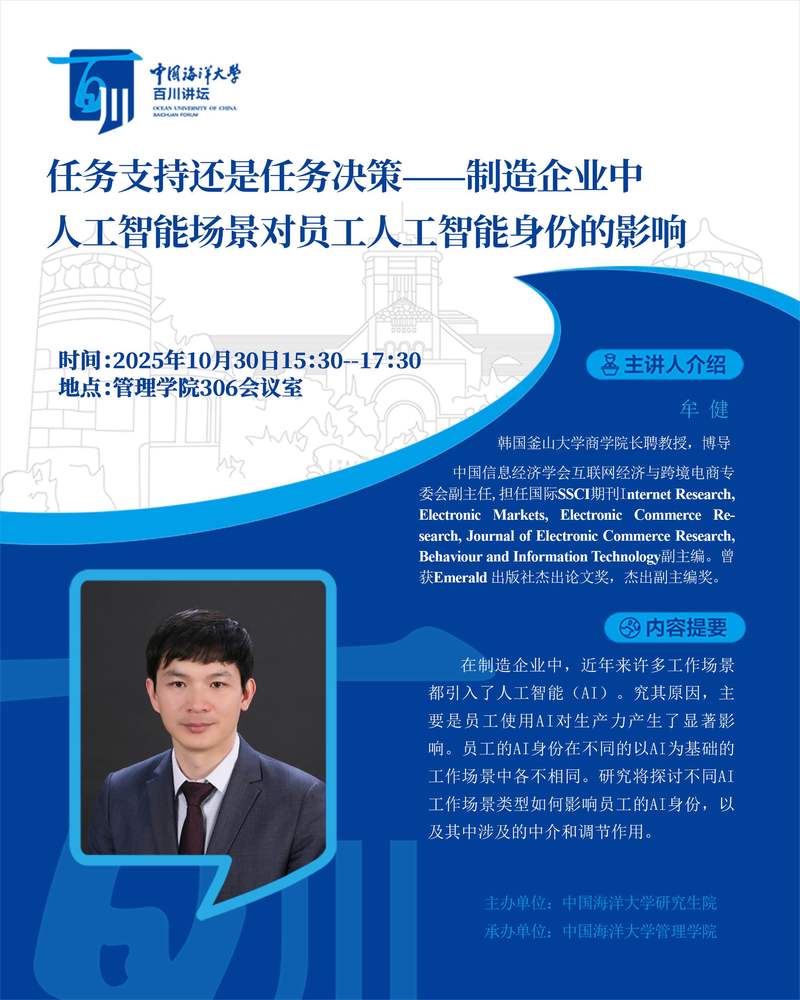 研究生百川讲坛第541讲-牟健:任务支持还是任务决策——制造企业中人工智能场景对员工人工智能身份的影响