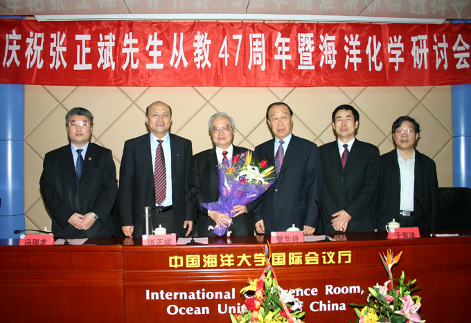 管华诗在致词中高度评价了张正斌先生从教47年来所取得的丰硕成就,他说,今天我们欢聚一堂,热烈祝贺我国海洋化学界著名学者、国家级教学名师张正斌教授从教47周年非常有意义,我校海洋化学事业能有今天蓬勃向上的繁荣景象,离不开张老师等老一辈师长的开拓奋进和无私奉献,近50年来,张老师为海洋大学,为海洋科学的发展奉献了一大批具有开拓性的科研成果,培养了一大批高层次优秀人才,直至今日,张老师仍然辛勤地耕耘在教学、科研第一线,承担着重要的研究任务,他这种爱岗敬业、为人师表的高尚品质值得每一位海大人去学习。最后,管华诗祝愿张正斌先生在继续探索海洋化学王国的征途中取得新的成果,为灿烂的海洋人生谱写更加美丽的篇章!