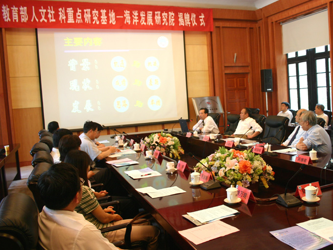 本站讯 作为教育部人文社科百所重点研究基地之一、我国“985工程”二期建设哲学社会科学创新基地的依托机构,我校海洋发展研究院6月12日举行了隆重的揭牌仪式。教育部社政司科研处处长张东刚与校党委书记冯瑞龙共同为教育部人文社科重点研究基地——中国海洋大学海洋发展研究院揭牌。党委副书记、海洋发展研究院院长李耀臻,副校长吴德星、翟世奎,山东省委宣传部副部长张全新,海军军事学术研究所副所长张炜,国家社科规划办原主任董京泉,我校“985工程”哲学社科创新基地首席专家、教育部人文社科重点研究基地学术委员会主任杨国桢,校长助理徐祥民等出席仪式。