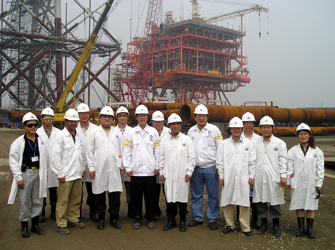 吴德星校长(右六)与杨树波总经理(左七)等校企有关负责人、专家来到海洋石油工程股份有限公司工地现场视察