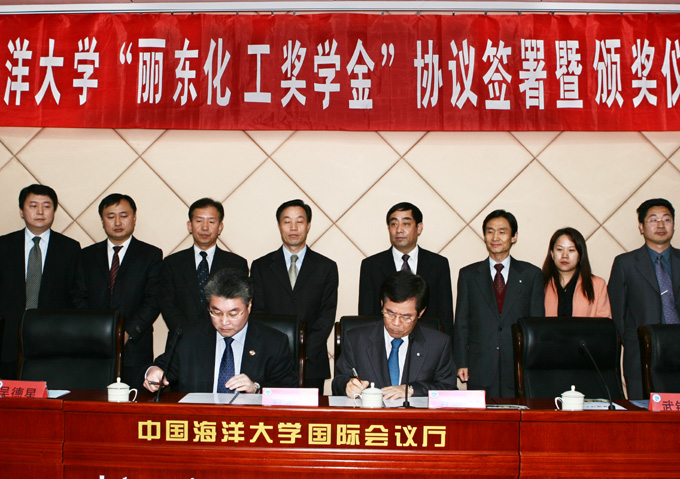 吴德星校长在致词中代表学校对出资设立奖学金的丽东化工有限公司和长期支持学校发展的青岛市对外贸易经济合作局表示谢意。他说,在80多年的发展历程中,海洋大学得到了社会各界的大力支持,学校将进一步发挥自身优势,为青岛经济的发展做出应有的贡献。武铁军局长和尹奉台总经理也在仪式上作了发言。