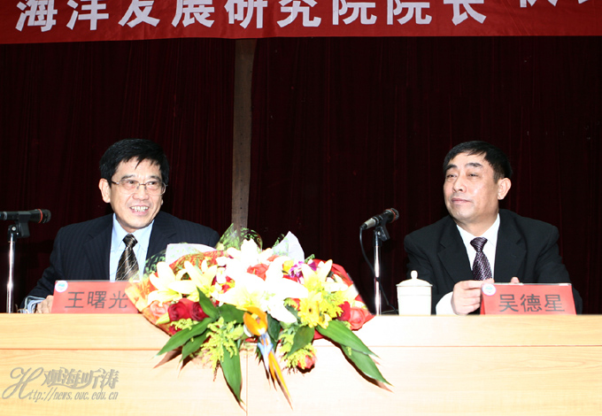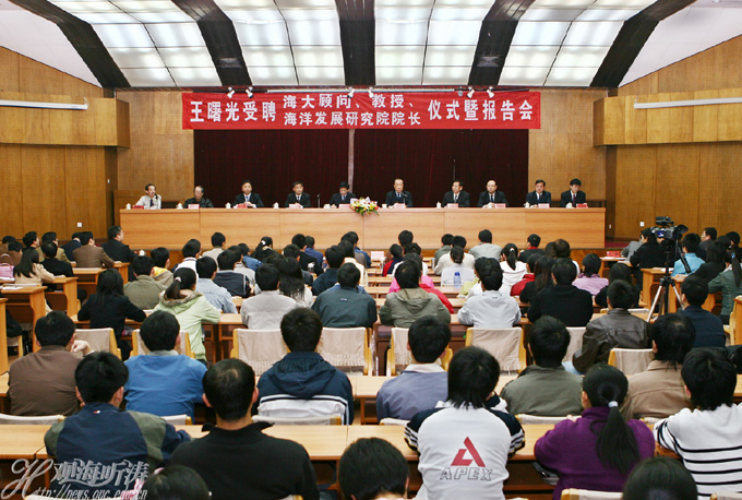 王曙光发表了受聘感言。他说,受聘海大主要有四个原因:一是热爱海洋,11年的海洋管理工作经历让我对海洋情有独钟;二是反哺母校,是母校老师的不倦教诲赐予我智慧和力量,并使我获得了在国家最高海洋行政部门为国家海洋事业做贡献的机会,现在理应报效母校,为享誉海内外的海洋大学贡献力量;三是朋友情谊,是海洋大学的老师和朋友们的情意和事业心令我感动,学校以友情、事业相邀,我本人当以真诚相报;四是充当“使者”,国家海洋局和海洋大学多年来风雨同舟,相互帮助,我作为海洋局的“使者”来到海大工作,可以使双方优势互补,加强合作,加深友谊。王曙光表示,在他担任海洋发展研究院院长之后,力求在3年左右的时间里,在达到教育部要求的基础上,将海洋发展研究院某些领域的研究水平提升到国内一流水平,有些研究成果进入国家决策。