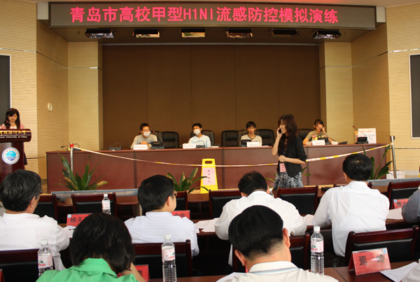 本站讯 近日,甲型H1N1流感在青岛爆发,且感染人数在不断增加,为认真做好青岛各高校的疫情控制工作,9月18日下午,青岛市高校甲型H1N1流感防控模拟演练在中国海洋大学崂山校区图书馆第二会议室举行。青岛市副市长王修林,青岛市卫生局局长曹勇,青岛市委高校工委副书记王金生,中国海洋大学校长助理徐天真以及驻青各高校的有关领导观看了演练。