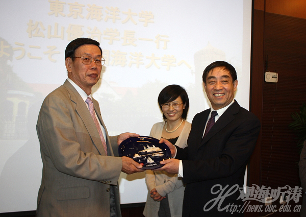 松山优治对中国海洋大学的热情接待表示感谢,并介绍了东京海洋大学的基本情况和此次来访的目的。他说,中日的涉海高校应加强联系,借鉴经验,增进友谊,在交流与合作中实现共赢。松山优治还充分肯定了海大留学生在东京海洋大学的优秀表现,并希望海大能够继续派遣留学生赴日学习。