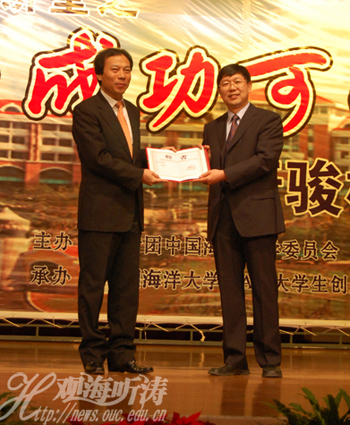 本站讯 2010年4月7日晚,唐骏在中国海洋大学崂山校区大学生活动中心为广大师生做题为“我的成功可以复制”的报告。中国海洋大学副校长李巍然出席报告会,并为唐骏颁发“中国海洋大学大学生创业导师”荣誉聘书。报告会由海大团委、学生会、研究生会主办,由海大大学生KAB创业俱乐部和大学生创业联合会承办。