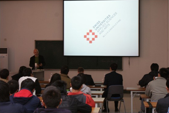 随后,Markus Reubi参赞与尼泊尔应用科学大学建筑学院院长Peter Bolsterli教授向海大师生作了关于瑞士留学和低碳经济方面的报告。