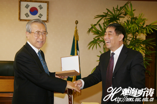 韩国学中央研究院院长金贞培(左)与中国海洋大学校长吴德星亲切握手
