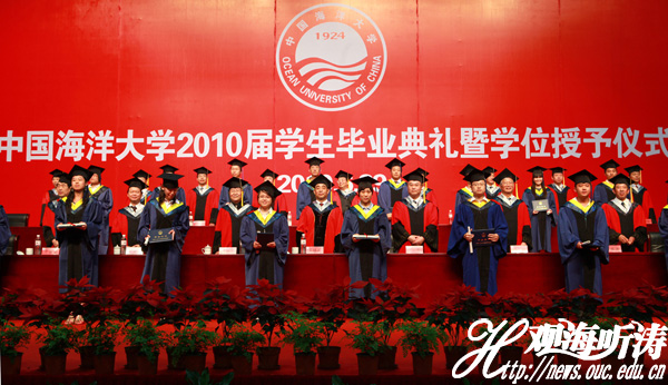 本站讯 2010年6月29日,在中国海洋大学崂山校区体育馆隆重举行2010届研究生毕业典礼暨学位授予仪式。238名博士生、1933名硕士生身着学位服济济一堂,收获他们学有所成的喜悦。