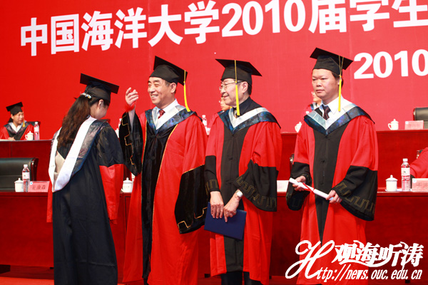 校学位评定委员会成员、副校长李华军主持毕业典礼,校学位评定委员会副主席、副校长董双林宣读了《中国海洋大学关于授予硕士学位和博士学位的决定》。教师代表、中国工程院院士麦康森,毕业生代表、2007级水产养殖专业博士研究生丁森,在校生代表、2009级经济法学硕士研究生牛晓在典礼上分别发言。