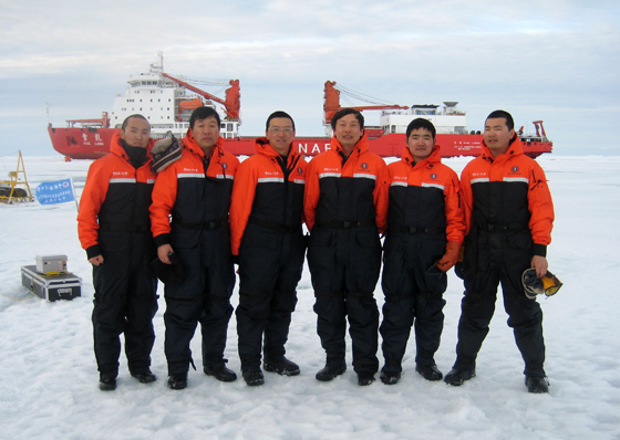 海冰光学组全体队员在“雪龙”号极地科学考察船前合影(右三为赵进平教授,左三为史久新教授)