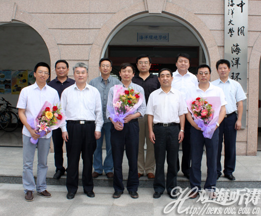 党委书记于志刚(前排左二),校长吴德星(前排右二)与赵进平教授(前排中)、矫玉田高级工程师(前排右一)、史久新教授(前排左一)等合影