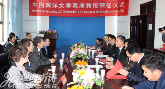 本站讯 12月8日,聘任加拿大麦吉尔大学阿方索·缪西(Alfonso Mucci)教授和拉瓦尔大学杰恩埃里克·特伦布莱(Jean-Eric Tremblay)教授为中国海洋大学客座教授仪式在化学化工学院举行。党委书记于志刚为两位教授颁发了聘书。加拿大拉瓦尔大学教授、加拿大SOLAS主席、中国海洋大学客座教授毛瑞斯·来瓦色教授出席了聘任仪式。【点击查看英文版】