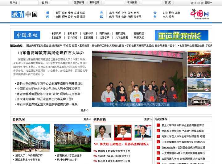 “中国名校”(域名:http://U.edu.china.com.cn)定位在国内著名高等院校的宣传推介上,下设“名校风采、校长访谈、名校展播、图画校园、优秀学子、最美高校”等12个子栏目,网页布局合理、美观大气,宣传内容翔实、层次分明。集图片、文字、视频等多种宣传样式于一体,充分发挥网络媒体的信息宣传优势,积极向广大网民介绍中国高校发展建设的新成就、新突破、新思路,力争经过几年的发展,在广大网民中形成“想了解中国高校,上中国网,看中国名校”的效应。