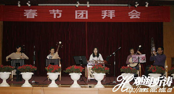 中国海洋大学艺术系和海大附中的师生在团拜会上表演了精彩的文艺节目。