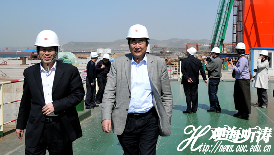 于宜法副校长(左)与山东汇洋集团董事长王轰在船业公司现场考察