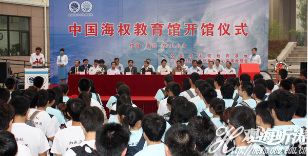 本站讯 2011年6月8日是第三个全国海洋宣传日,也是世界海洋日,由国家海洋局资助、中国海洋大学承建的中国海权教育馆于当日在中国海洋大学崂山校区隆重开馆。教育部体艺卫司高军处长、国家海洋局北海分局滕祖文副书记、海军南沙守备部队李文波大校、中国海洋大学吴德星校长共同为中国海权教育馆揭牌。