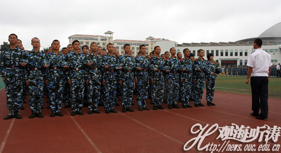 新生代表和军训教官代表也在大会上作了发言。学校相关负责人传达了2011年学生军训工作计划。动员大会的召开标志着为期两周的中国海洋大学2011级学生军训正式拉开了帷幕。