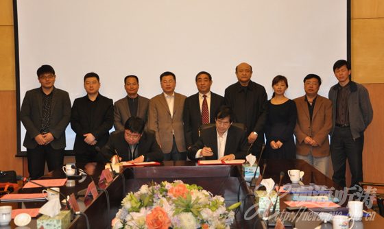 中国海洋大学副校长于宜法(前排右)与汉力士船用推进系统股份有限公司领导签署奖学金设立协议