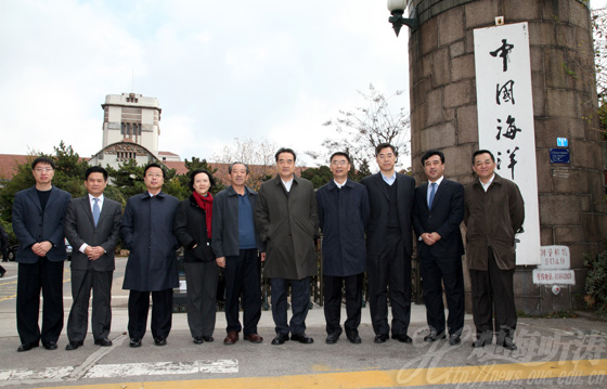 2011年11月23日上午,商务部原副部长廖晓淇(前排中)一行在青岛市副市长姚坚、副秘书长李刚,中国海洋大学党委副书记李耀臻的陪同下,来到海大鱼山校区,先后参观了六二楼、胜利楼、地质馆、档案馆、闻一多故居。参观结束后,廖晓淇表示,中国海洋大学悠久的办学历史、深厚的校园文化及独具特色的校园建筑给他留下了深刻的印象。