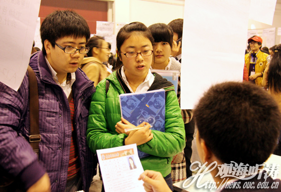 张静在接受采访时说,海大2012届毕业生为六千余人,与去年相比有所增加,但“目前我校学生已有八九百人和企业签订了就业合同,从这个方面来说我们学校就业趋势还是良好向上的”。并且学校还会通过职业生涯规划学习、建设见习基地、推荐优秀学生等方式为毕业生和企业之间搭建桥梁。“这次是青岛高校和市人力局合作组织的一次规模较大、层次较高的招聘会。”她希望2012届毕业生能紧紧抓住这次机会,全方位展示自己以谋求更好地职位,但也不要把招聘会看成是就业的唯一方式,即使没有找到合适的岗位,也不要气馁,以后的机会还很多。