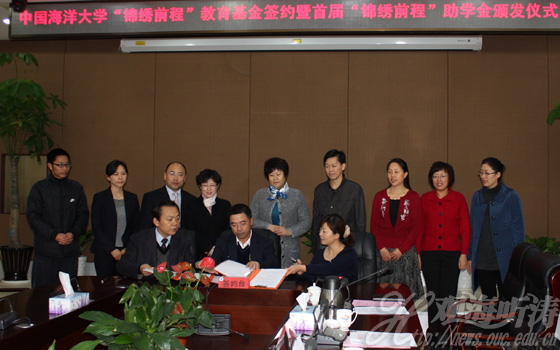 本站讯 12月2日上午,中国海洋大学“锦绣前程”教育基金签约暨首届“锦绣前程”助学金颁发仪式在崂山校区图书馆第一会议室举行。青岛锦绣前程房地产开发有限公司董事长郭程,海大党委副书记张静等出席仪式,并为获奖学子颁奖。郭程董事长,海大教育基金会、校友会秘书长陈忠红,法政学院院长徐祥民共同签署“中国海洋大学·青岛锦绣前程房地产开发有限公司教育基金”捐赠协议书。