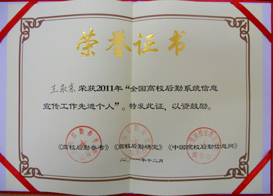 王永东同志荣获“2011年全国高校后勤系统信息与宣传工作先进个人”称号