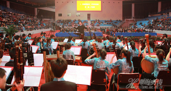 本站讯 2011年12月23日晚,中国海洋大学崂山校区体育馆内灯火通明,人头攒动,海大2012年新年音乐会在这里如期举行。场馆内鲜明的红色彰显着海大人迎接新年的喜悦,欢快的旋律表达出海大人如火的热情。长达两小时的演出为大家提供了一场音乐盛宴。
