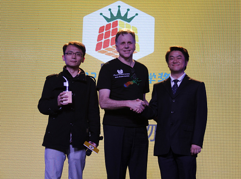 王传超(左)在首届菠萝科学奖医学生物奖典礼与颁奖人、2005年诺贝尔医学奖得主巴里·马歇尔(中)合影