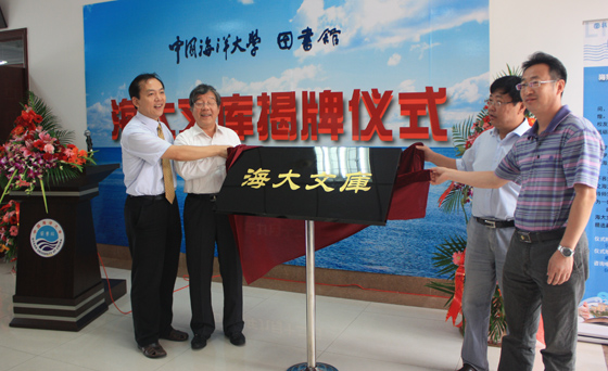 董双林(左二)、管长龙(右一)、徐祥民(左一)、曹志敏为海大文库揭牌