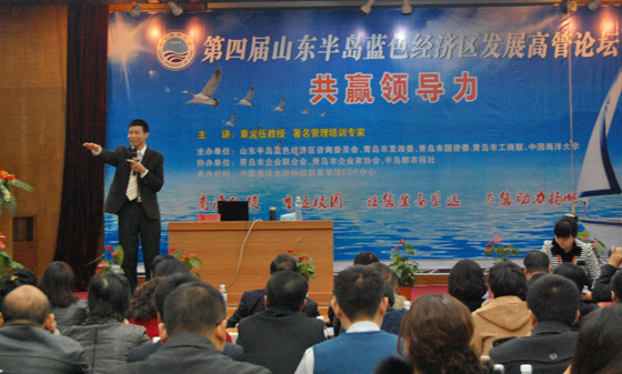 本站讯 11月20日,主题为“共赢领导力”的第四届山东半岛蓝色经济区发展高管论坛在中国海洋大学鱼山校区逸夫馆多功能厅举行。论坛由山东半岛蓝色经济区咨询委员会、青岛市发展改革委员会、青岛市国有资产监督委员会、青岛市工商联和中国海洋大学联合主办,青岛市企业联合会、青岛市企业家协会和半岛都市报社协办,海大继续教育学院EDP中心承办。主讲人为著名管理培训专家章义伍教授。