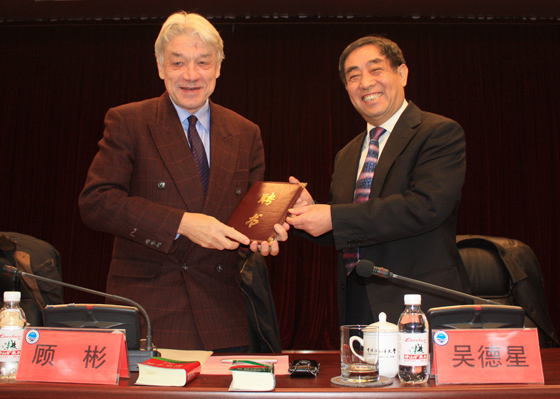 本站讯 2012年12月15日上午,中国海洋大学外国语学院德语系成立典礼暨顾彬教授聘任仪式在崂山校区举行。当代作家、中国海洋大学顾问王蒙先生、吴德星校长出席仪式。李巍然副校长主持仪式。【点击查看英文版】