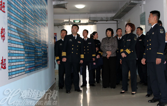 部队领导及海军驻校选培办干部业务集训班学员在张静副书记的陪同下到国防生宿舍检查指导工作,并参观了中国海权教育馆。