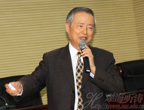 本站讯 10月23日,中国海洋大学邀请台湾成功大学名誉教授欧善惠到校以“追求卓越,迈向顶尖——谈海洋特色大学的发展”为主题做学术报告。欧善惠教授在报告中联系当前中国大学发展形势和自身教育工作经历,提出大学教育的关键所在,即:教授、校友和学术风气,并从一流教授、一流校友、大学评比、迈向顶尖四个角度分别进行了讲解。