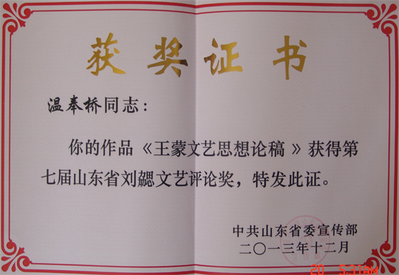 其中,薛永武教授的《中国文论经典流变——<礼记·乐记>的接受史研究》入选文艺研究类获奖成果,温奉桥教授的《王蒙文艺思想论稿》入选文艺评论类获奖成果。山东省刘勰文艺评论奖评选工作已开展七届,这是中国海洋大学教授第一次获得该奖项,标志着学校在文艺研究和评论领域的科研实力提升到了新水平。同时也说明了中国海洋大学在促进国家文艺事业繁荣和服务地方文化事业发展方面做出了不懈的努力和探索。