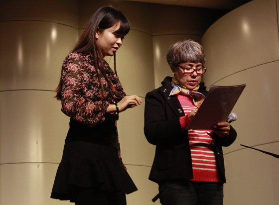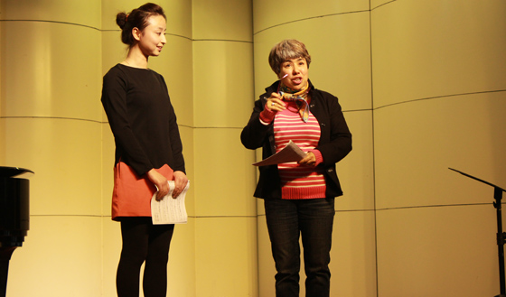 首先上台的是中国海洋大学音乐表演专业2013级硕士陈诗凯,他演唱了一首选自歌剧《弄臣》的经典歌曲《女人善变》,扎实的演唱功底和成熟的演唱技巧得到了迪里拜尔的肯定。在随后的指导中,迪里拜尔针对陈诗凯的发音问题进行逐句的纠正,甚至细微到每一个字母,同时她也告诉台下的同学“当我们拿到新的谱子时一定要细读歌词、朗诵歌词。我们出去比赛最吃亏的就是语言,唱歌不仅要有声音,语言同样重要,所以一定要两条腿一起走路。”