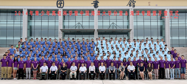单长勇和林兆谦分别向中国海洋大学分营、海洋科学专题营的营员代表授旗。单长勇主任宣布2014青少年高校科学营中国海洋大学分营、海洋科学专题营正式开营。此次科学营专设的“HiYoung”微信平台也随即启用。