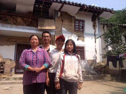 在受损严重的房屋前,灾民李春发一家仍然对未来充满信心