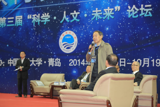 本站讯 2014年10月18日-19日,在中国海洋大学建校90周年之际,以“教育实现梦想”为主题的第三届“科学·人文·未来”论坛在中国海洋大学崂山校区体育馆举行。来自不同领域的21位文史哲专家以及科教、企业界专家齐聚海大,谈科学精神,谈人文情怀,谈教育理念,谈未来发展,自然科学与人文精神相映生辉,碰撞出耀眼的火花。