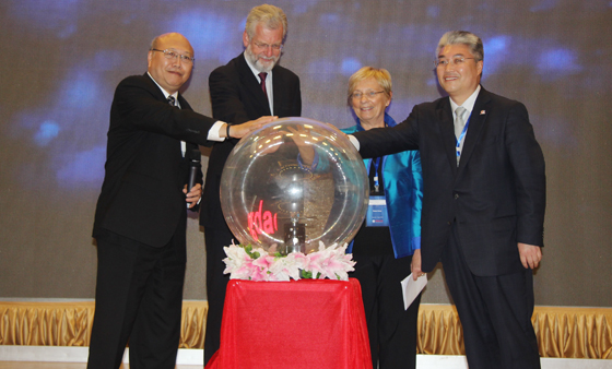 于志刚校长(右一)、Susan Avery博士(右二)、Kenneth Lee博士(左一)和Peter Herzig教授发布《未来海洋青岛共识》