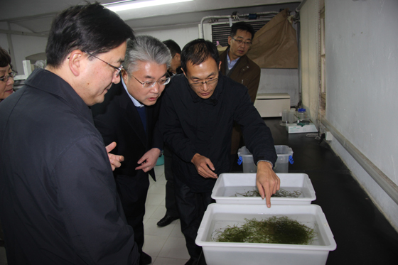 刘为民厅长(左一)、于志刚校长(左二)考察中国海洋大学大型海藻种质资源库