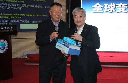 现场,秦大河把他编著的关于气候变化的书籍赠送给中国海洋大学,于志刚校长代表学校接受了捐赠,并向秦大河院士表示感谢。
