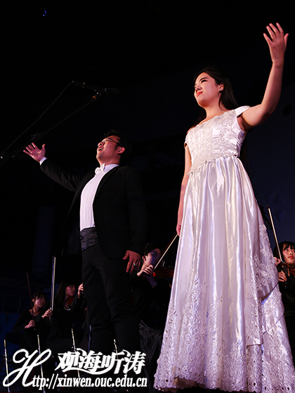 随后上场的是中国海洋大学交响乐团。他们首先演奏了理查德·罗杰斯的经典之作《音乐之声》。随后,青年教师王莹莹带来木笛独奏《牧民新歌》。笛声清新嘹亮,配合乐队伴奏,使听众不禁畅想牧民在辽阔草原上骑马驰骋、自由生活的场景。陈诗恺演唱了由意大利著名作曲家贾科莫普契尼创作的著名歌剧《图兰朵》中最著名的一段咏叹调《今夜无人入睡》。紧接着,肖京演唱了约翰施特劳斯的轻歌剧《蝙蝠》节选《笑之歌》,用嘹亮的的美声模拟不同的笑声。随后,两位演唱者合唱《饮酒歌》,其间,二人拉手在舞台上轻轻起舞。轻快的舞曲节奏表现出《茶花女》歌剧中主人公对真诚爱情的渴望与赞美。