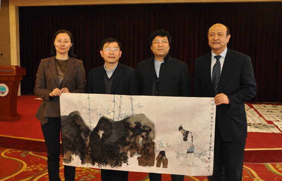 图为山东省政协副秘书长王琳、学校党委书记孙也刚、山东画院院长孔维克、教育基金会理事长冯瑞龙(从左至右)共同展示画作