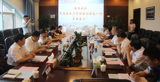 本站讯 7月6日上午,华南农业大学校长陈晓阳、副校长刘雅红一行7人到中国海洋大学调研,校长于志刚、副校长董双林等在行远楼第三会议室欢迎客人的到来,并就有关内容做了介绍。