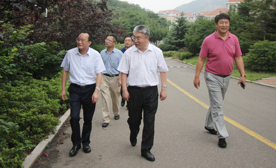 于志刚校长(中)陪同陈晓阳校长(左)参观崂山校区
