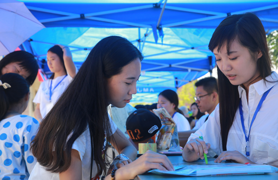 在各学院设立的迎新服务站,一顶顶帐篷依次排开,党员示范岗、摆渡车停靠点、问讯处……志愿者们都在用热情的微笑和细致的服务欢迎新同学的到来。有的手举指示牌、有的指引路线、有的做好登记、有的忙着搬运行李、有的耐心介绍入学后需要注意的事项。在管理学院设立的朋辈导师示范岗前,大二的代维高同学正在耐心地给远道而来的师弟介绍即将开展的大学军训中需要注意的事项,以及本专业的课程设置情况。水产学院2014级的李墨竹同学表示,她入学时,也得到了学长学姐的热情帮助,今天自己要把这种精神传下去,让师弟师妹一入学就感受到温暖。在广大志愿者的共同努力下,学校的迎新工作进行的有条不紊,他们的辛勤付出,也赢得了新生和家长的一致赞赏。