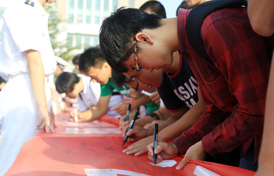 海大学子在横幅上签名