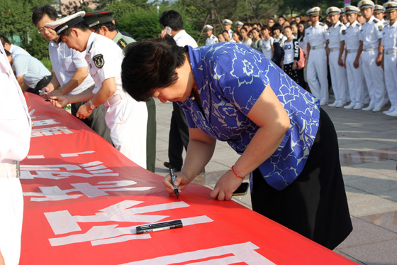 张静常务副书记在写有“铭记历史,缅怀先烈;勤奋学习,振兴中华”的横幅上签名