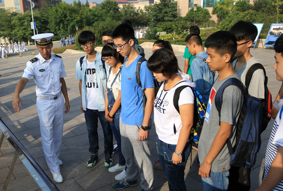 升旗仪式结束后,师生们纷纷在写有“铭记历史,缅怀先烈;勤奋学习,振兴中华”的横幅上签名,并参观了中国海军主题展版。在参观过程中,海军博物馆的工作人员为学生们讲述了中国抗日战争中涌现的可歌可泣的历史史实。学生们在展板前细心聆听,收获颇多。