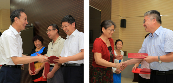 鞠传进书记(左图)、于志刚校长(右图)为从事教育工作30年的教职工代表颁发荣誉证书